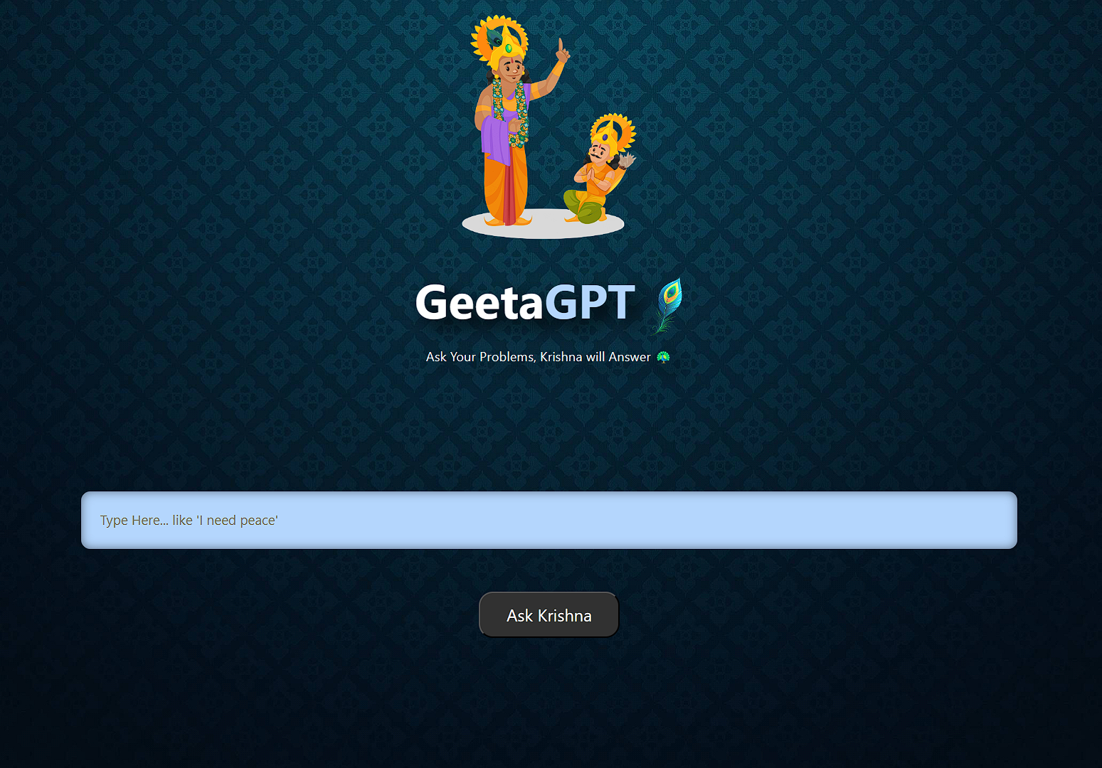 GeetaGPT is a GPT based Chatbot made with Flask which possesses knowledge about Shrimadvagwat Geeta and act like Lord Krishna. It acts like a replica of Lord Krishna with the vast knowledge of Shimadbhagwat Geeta and can answer your problems about life. It is built with Flask and Django